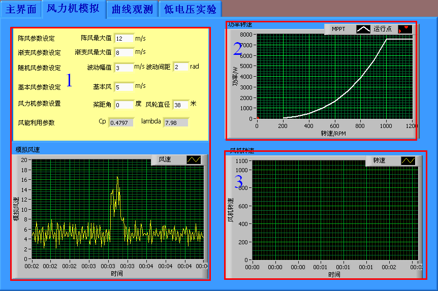 实现风速和风力机模拟,机组并网控制,机组最大功率运行控制,机组恒速运行,机组限功率运行,机组低电压穿越,机组脱网控制等控制功能;