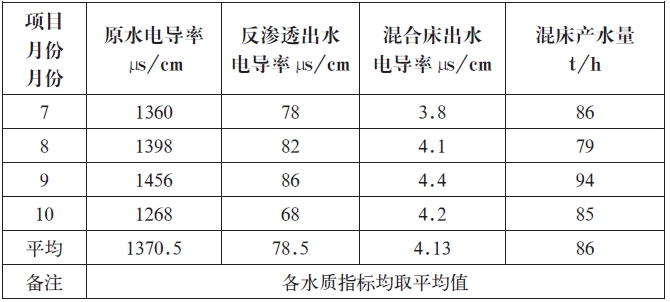 反渗透出水经阴阳离子交换器处理,将出水电导率控制在20μs/cm以下后进入混合离子交换器进行二次脱盐,最后生产出电导率<5μs/cm的除盐水。