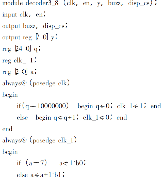 可以看出,在VerilogHDL中,74138的功能由一个case语句实现,分频器的功能是由两个计数器级联实现,其中一个计数器将系统时钟49.152MHz进行10M分频,另一个计数器将时钟系统进行8分频,这样LED灯的流动频率大概为0.6Hz。系统另设一个使能信号en,当en=0时,74138正常工作;当en=1时,保持原来的状态不变。而原理图中对disp_cs=0和buzz=1的设定,在VerilogHDL中用assign语句来实现。