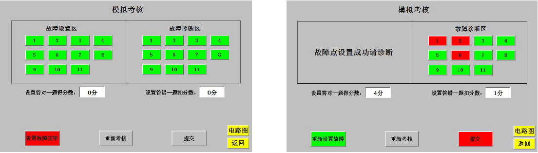 为了应对综合实训与技能鉴定两种不同场合的实际使用情况,考核模式的操作权限设置“教师(考评员)”与“管理员”两种不同的用户组,分别对应不同的密码。其中对故障设置、故障判断、系统设置和返回功能的操作权限对两个用户组均开放。其中修改密码权限仅对“管理员”用户组开放,且“管理员”用户组不仅能修改本组操作密码,亦能修改“教师”用户组的密码,避免教师间修改密码缺乏沟通或者学生掌握密码后随意修改导致密码丢失。